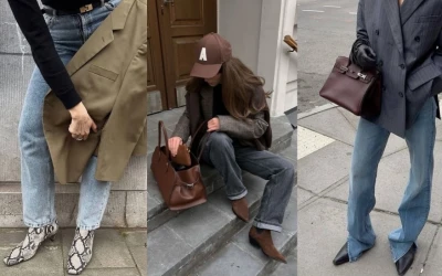 Deväťdesiate roky zostávajú nevyčerpateľným zdrojom inšpirácie, najmä pokiaľ ide o čisté línie, jednoduché kombinácie a prirodzenú eleganciu. Dlhé, mierne rozšírené džínsy v tmavom odtieni v spojení s členkovými čižmami so špicatou špičkou vytvárajú look, ktorý pôsobí upravene a sebavedomo bez toho, aby si vyžadoval zložité vrstvenie.