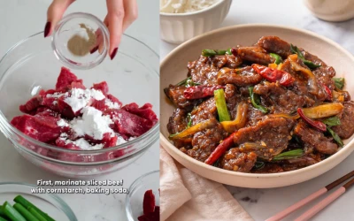 Hovädzie mäso najskôr pripravte na marinovanie. Nakrájané plátky vložte do väčšej misy a premiešajte ich s jedlou sódou, kukuričným škrobom, ryžovým vínom Shaoxing, vodou, sójovou omáčkou, bielym korením a trochou oleja. Marináda mäso zjemní a zabezpečí, aby zostalo šťavnaté aj po rýchlom opekaní.