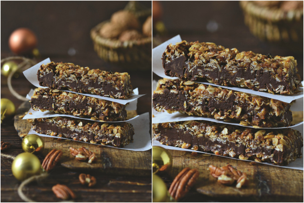 Na prípravu korpusu necháme v hrnci skaramelizovať cukry s maslom. Odstavíme z variča a vmiešame ovsené vločky. Polovicu korpusu nanesieme na plech vyložený papierom na pečenie a pomocou lyžice uhladíme. Na prípravu náplne zahrievame vo vodnom kúpeli kondenzované mlieko a nalámanú čokoládu, kým sa čokoláda úplne nerozpustí. Potom vmiešame orechy a náplň opatrne rozotrieme na polovicu korpusu. Na povrch nanesieme zvyšok korpusu. Na prípravu karamelu necháme v hrnci skaramelizovať cukor. Potom opatrne pridáme vodu, maslo a mlieko. Karamel za stáleho miešania krátko povaríme a ihneď nanesieme na povrch zákuska. Odložíme do chladničky a necháme stuhnúť.